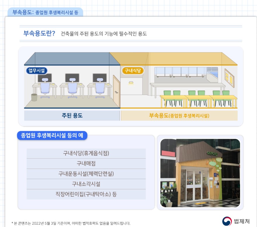 부속용도로 대부분 종업원 후리복리리시설로 보면 됩니다. 구내식당(휴게음식점),구내매점,구내운동시설(체력단련실),구내소각시설,직장어린이집(구내탁아소) 등이 있습니다.